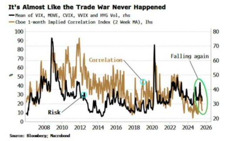 文章还深入分析了一个技术性但至关重要的概念:股票的隐含相关性。这个指标衡量标普500指数中个股走势的协同程度。当相关性较低时,意味着股票更多地在独立波动,而不是齐涨齐跌。