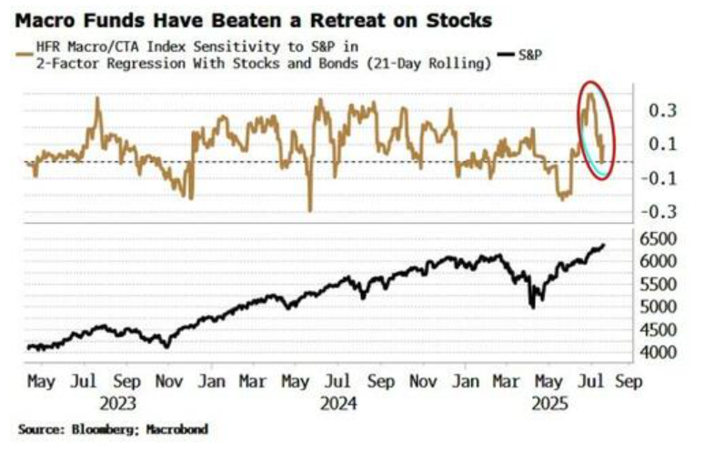 文章指出,尽管美股看似仍在上涨,但以宏观基金和量化基金为代表的对冲基金群体,已经对股票表现出了明显的冷淡态度。怀特认为,这种转变通常预示着未来市场回报率的走低。