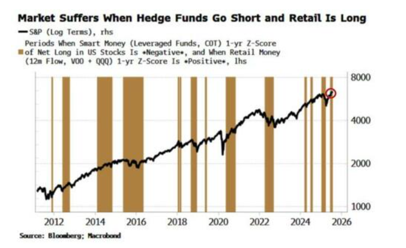 那么,这是否意味着他们察觉到了什么?怀特认为答案很可能是肯定的。他提供的数据显示,当宏观基金和CTA基金这类“聪明钱”做空股票,而正如现在这样,散户投资者却在做多时,历史性地预示着未来1-3个月股市表现将趋于疲软。