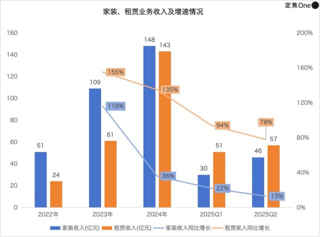 2025 年第二季度,家装和租赁业务合计占总收入的 40%,相比 2022 年有大幅提升。进一步细分,2024 年家装业务的贡献利润率是 30.7%,租赁业务为 5.0%。