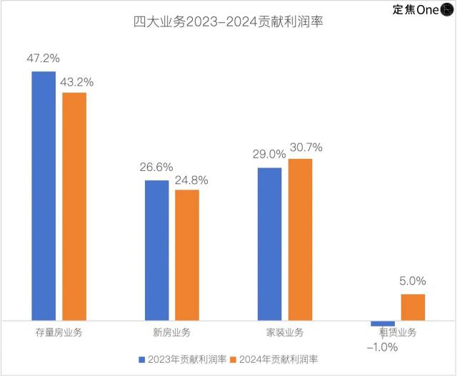 虽然新房业务贡献了更多收入,但更赚钱的是二手房业务。根据 2024 年年报数据,存量房业务的贡献利润率高达 43.2%,远高于新房业务。也就是说,二手房业务量小利厚,新房业务量大利薄。