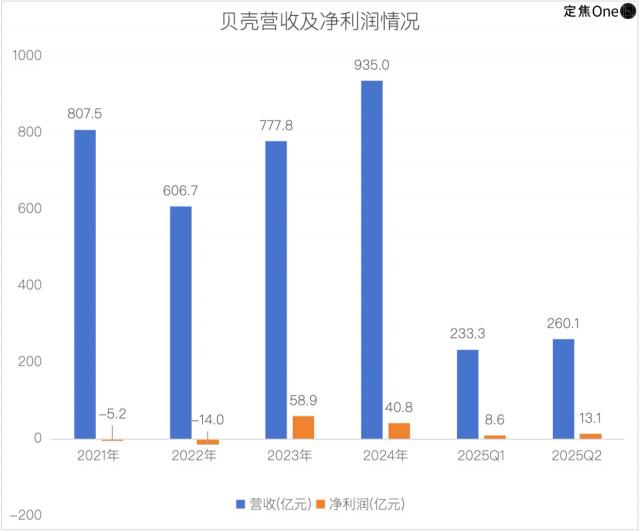 要理解贝壳的业绩困境,需回顾其过去几年的表现。从 2021 年到 2025 年第二季度,贝壳的业绩轨迹堪称"过山车":