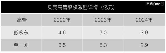2022 年 5 月,贝壳推出股权激励计划,宣布向彭永东和单一刚分别派发 7182 万股和 5386 万股。按照当时的股价计算,这分别价值 25 亿人民币和 18 亿人民币。这些股份分 5 年解锁,从 2022 年到 2024 年,两位高管已经获得的股份价值分别达到 15.5 亿和 11.6 亿。