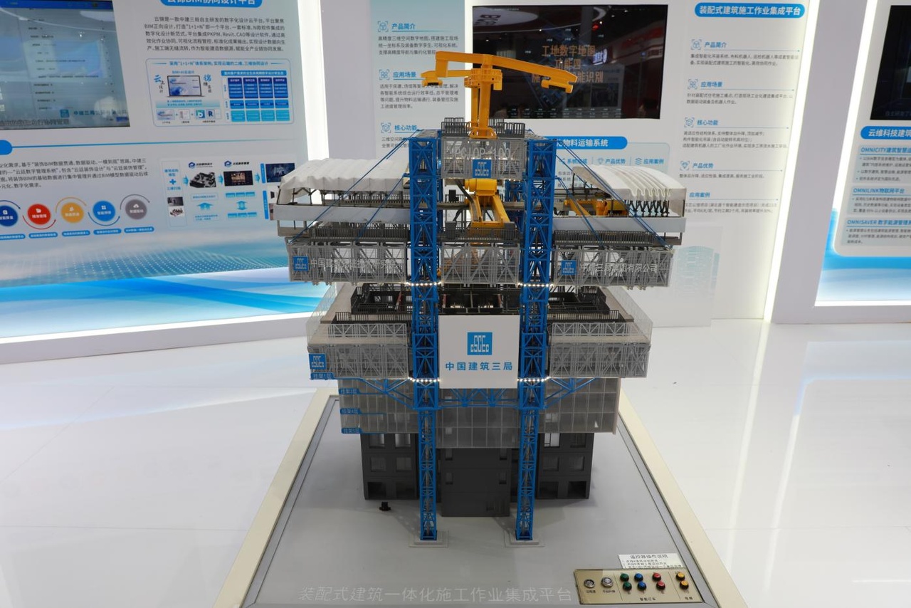 进入位于8号馆的中建三局展厅,映入眼帘的就是装配式造楼机模型,这个由中建三局自主研发的大国重器,全称为装配式建筑一体化施工作业集成平台,是中建三局针对装配式住宅施工痛点研发的现场工业化建造集成平台,集成了系列施工装备及建筑机器人,可数据驱动装备及建筑机器人作业。